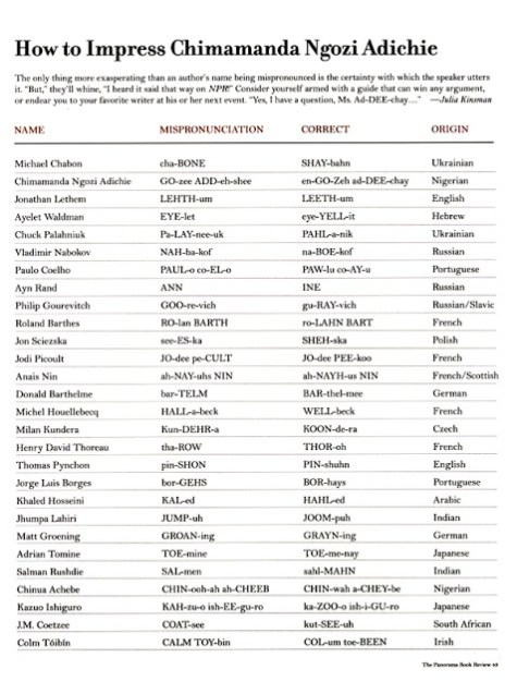 How to Impress Chimamanda Ngozi Adichie July 1, 2012 ~ Jennifer @ The Relentless Reader I don’t know about you but I feel like a moron when I don’t know the correct pronunciation of an author’s name. This handy dandy chart will be useful. via buzzfeed Share this: Click to share on X (Opens in new window) X Click to share on Facebook (Opens in new window) Facebook Like Loading... Related Published by Jennifer @ The Relentless Reader View all posts by Jennifer @ The Relentless Reader